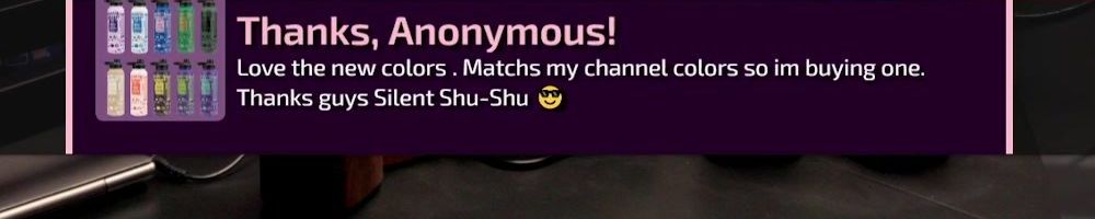 Thanks, Anonymous! Love the new colors . Matchs my channel colors so im buying one. Thanks guys Silent Shu-Shu 😎