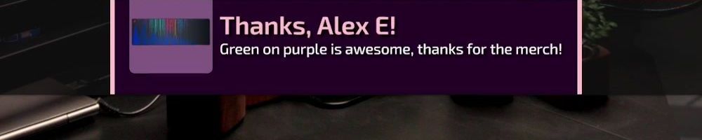 Thanks, Alex E! Green on purple is awesome, thanks for the merch!
