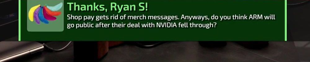 Thanks, Ryan S! Shop pay gets rid of merch messages. Anyways, do you think ARM will go public after their deal with NVIDIA fell through?