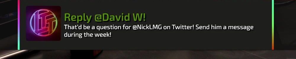 Reply @David W! That'd be a question for @NickLMG on Twitter! Send him a message during the week!