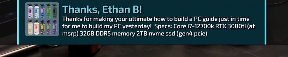 Thanks, Ethan B! Thanks for making your ultimate how to build a PC guide just in time for me to build my PC yesterday! Specs: Core i7-12700k RTX 3080ti (at msrp) 32GB DDR5 memory 2TB nvme ssd (gen4 pcie)