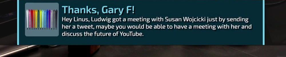 Thanks, Gary F! Hey Linus, Ludwig got a meeting with Susan Wojcicki just by sending her a tweet, maybe you would be able to have a meeting with her and discuss the future of YouTube.