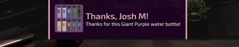 Thanks, Josh M! Thanks for this Giant Purple water bottle!