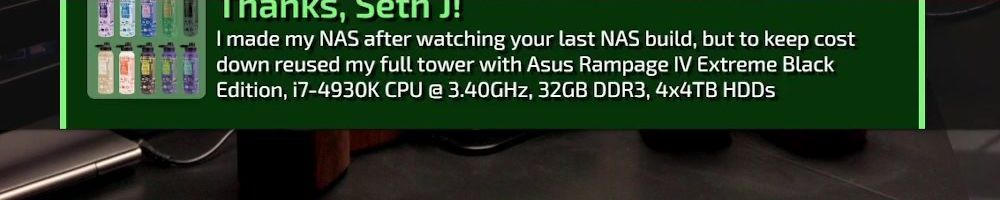 Thanks, Seth J: I made my NAS after watching your last NAS build, but to keep cost down reused my full tower with Asus Rampage IV Extreme Black Edition, i7-4930K CPU @ 3.40GHz, 32GB DDR3, 4x4TB HDDs