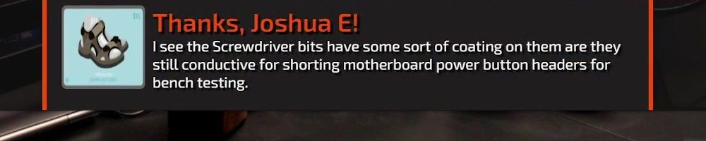 Thanks, Joshua E! I see the Screwdriver bits have some sort of coating on them are they still conductive for shorting motherboard power button headers for bench testing.