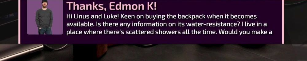 Thanks, Edmon K! Hi Linus and Luke! Keen on buying the backpack when it becomes available. Is there any information on its water-resistance? I live in a place where there's scattered showers all the time. Would you make a