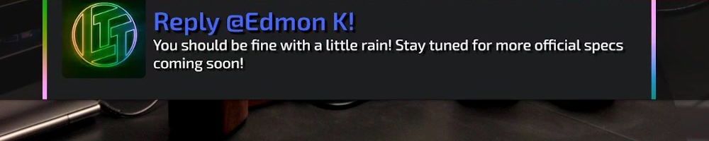 Reply @Edmon K! You should be fine with a little rain! Stay tuned for more official specs coming soon!