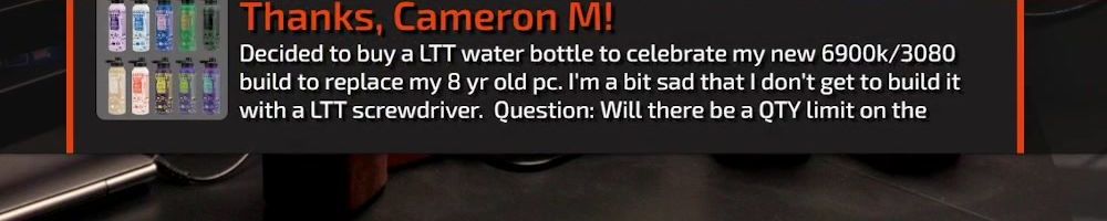Thanks, Cameron M! Decided to buy a LTT water bottle to celebrate my new 6900k/3080 build to replace my 8 yr old pc. I'm a bit sad that I don't get to build it with a LTT screwdriver. Question: Will there be a QTY limit on the