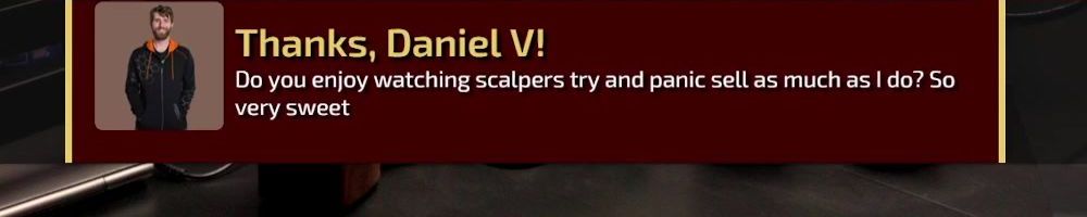 Thanks, Daniel V! Do you enjoy watching scalpers try and panic sell as much as I do? So very sweet