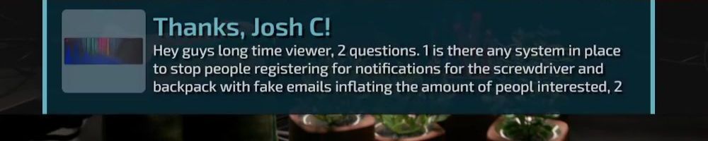 Thanks, Josh C! Hey guys long time viewer, 2 questions. 1 is there any system in place to stop people registering for notifications for the screwdriver and backpack with fake emails inflating the amount of peopl interested, 2