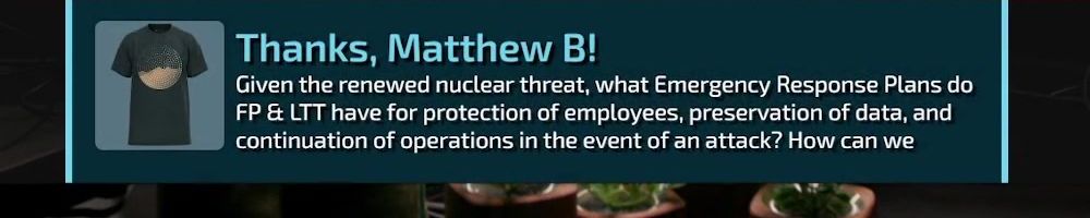 Thanks, Matthew B! Given the renewed nuclear threat, what Emergency Response Plans do FP & LTT have for protection of employees, preservation of data, and continuation of operations in the event of an attack? How can we