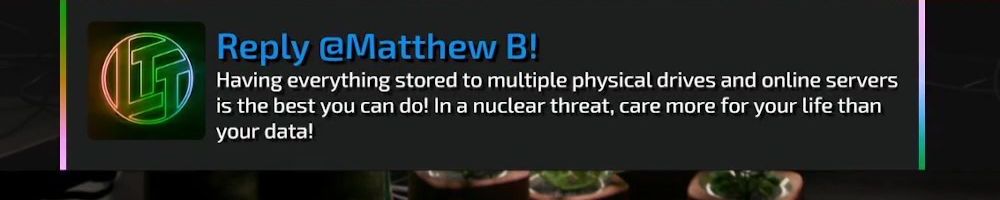 Reply @Matthew B! Having everything stored to multiple physical drives and online servers is the best you can do! In a nuclear threat, care more for your life than your data!