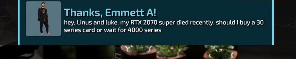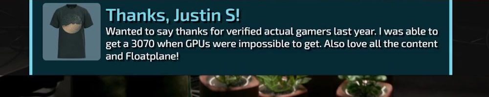 Thanks, Justin S! Wanted to say thanks for verified actual gamers last year. I was able to get a 3070 when GPUs were impossible to get. Also love all the content and Floatplane!