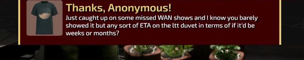 Thanks, Anonymous! Just caught up on some missed WAN shows and I know you barely showed it but any sort of ETA on the ltt duvet in terms of if it'd be weeks or months?