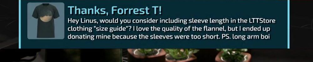 Thanks, Forrest T! Hey Linus, would you consider including sleeve length in the LTTStore clothing "size guide"? I love the quality of the flannel, but I ended up donating mine because the sleeves were too short. PS. long arm boi