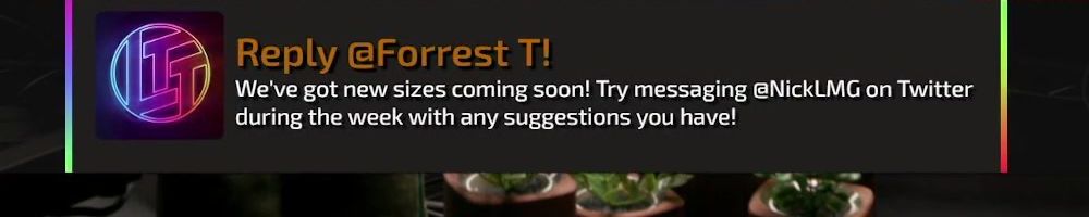 Reply @Forrest T! We've got new sizes coming soon! Try messaging @NickLMG on Twitter during the week with any suggestions you have!