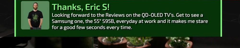 Thanks, Eric S! Looking forward to the Reviews on the QD-OLED TV's. Get to see a Samsung one, the 55" S95B, everyday at work and it makes me stare for a good few seconds every time.