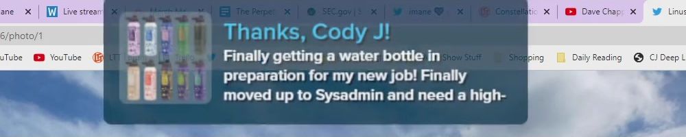 Thanks, Cody J! Finally getting a water bottle in preparation for my new job! Finally moved up to Sysadmin and need a high-
