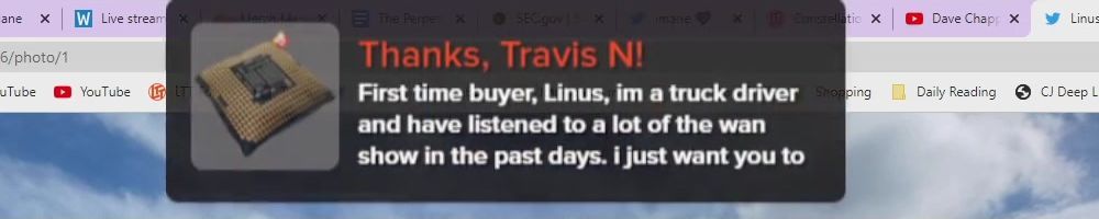 Thanks, Travis N! First time buyer, Linus, im a truck driver and have listened to a lot of the wan show in the past days. i just want you to