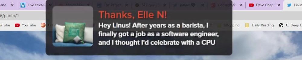 Thanks, Elle N! Hey Linus! After years as a barista, I finally got a job as a software engineer, and I thought I'd celebrate with a CPU