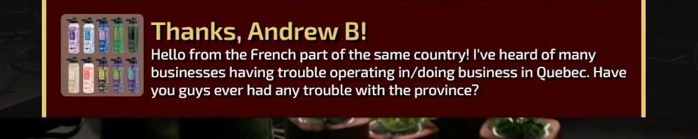 Thanks, Andrew B! Hello from the French part of the same country! I've heard of many businesses having trouble operating in/doing business in Quebec. Have you guys ever had any trouble with the province?