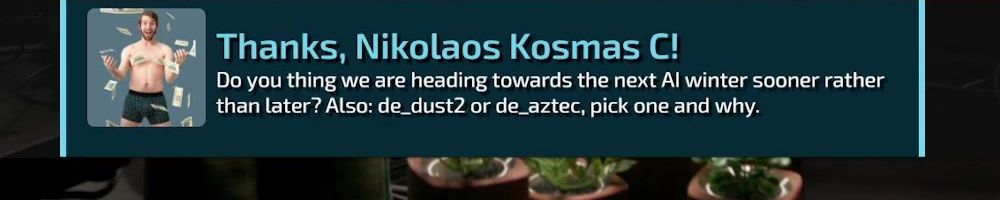 Thanks, Nikolaos Kosmas C! Do you thing we are heading towards the next Al winter sooner rather than later? Also: de_dust2 or de_aztec, pick one and why.