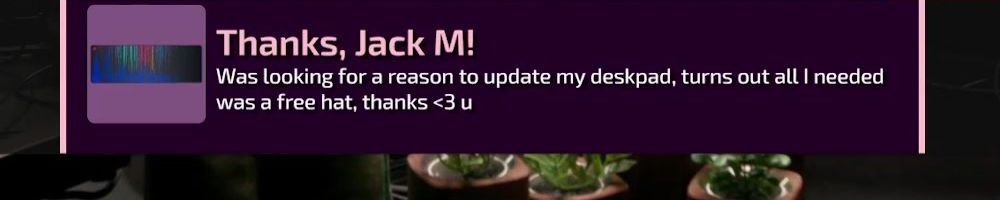 Thanks, Jack M! Was looking for a reason to update my deskpad, turns out all I needed was a free hat, thanks <3 u
