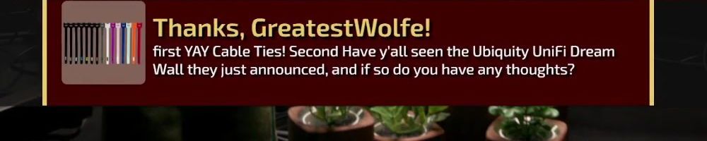 Thanks, GreatestWolfe! first YAY Cable Ties! Second Have y'all seen the Ubiquity UniFi Dream Wall they just announced, and if so do you have any thoughts?