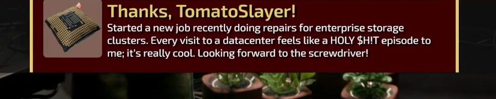 Thanks, TomatoSlayer! Started a new job recently doing repairs for enterprise storage clusters. Every visit to a datacenter feels like a HOLY $H!T episode to me; it's really cool. Looking forward to the screwdriver!