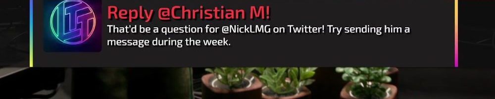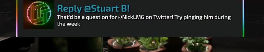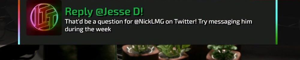 Reply @Joseph R! That'd be a question for @NickLMG on Twitter! Try sending him a message during the week.