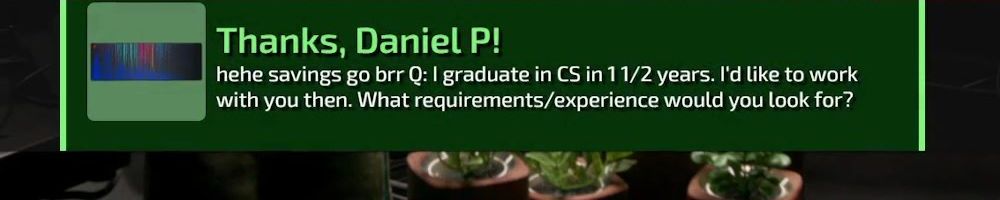 Thanks, Daniel P! hehe savings go brr Q: I graduate in CS in 11/2 years. I'd like to work with you then. What requirements/experience would you look for?