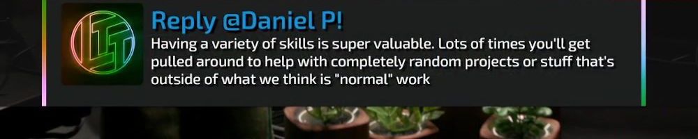 Reply @Daniel P! Having a variety of skills is super valuable. Lots of times you'll get pulled around to help with completely random projects or stuff that's outside of what we think is "normal" work