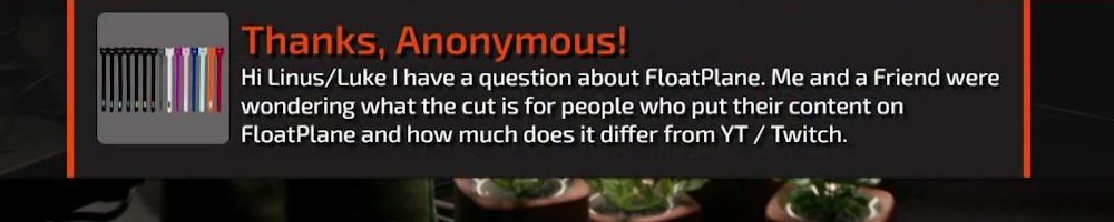 Thanks, Anonymous! Hi Linus/Luke I have a question about FloatPlane. Me and a Friend were wondering what the cut is for people who put their content on FloatPlane and how much does it differ from YT / Twitch.
