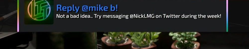Reply @mike b! Not a bad idea.. Try messaging @NickLMG on Twitter during the week!