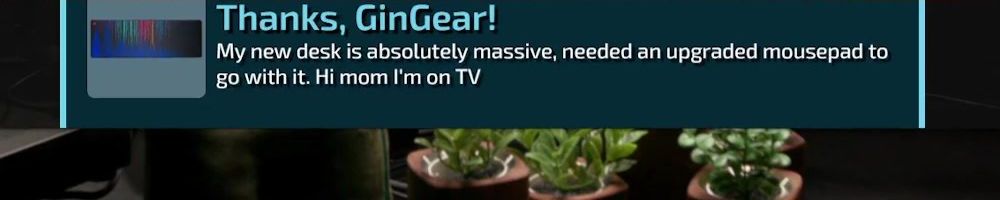 Thanks, GinGear! My new desk is absolutely massive, needed an upgraded mousepad to go with it. Hi mom I'm on TV