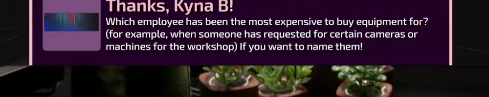 Thanks, Kyna B! Which employee has been the most expensive to buy equipment for? (for example, when someone has requested for certain cameras or machines for the workshop) If you want to name them!