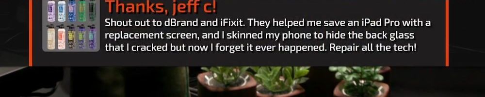 Thanks, jeff c! Shout out to dBrand and iFixit. They helped me save an iPad Pro with a replacement screen, and I skinned my phone to hide the back glass that I cracked but now I forget it ever happened. Repair all the tech!