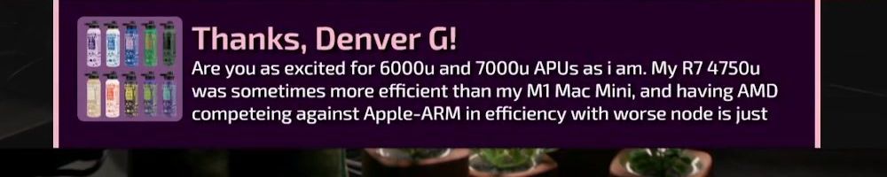 Thanks, Denver G! Are you as excited for 6000u and 7000u APUs as i am. My R7 4750u was sometimes more efficient than my M1 Mac Mini, and having AMD competing against Apple-ARM in efficiency with worse node is just