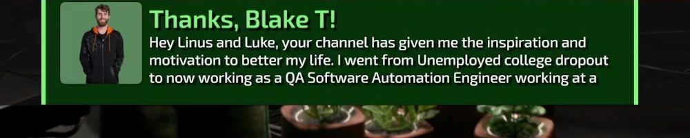 Thanks, Blake T! Hey Linus and Luke, your channel has given me the inspiration and motivation to better my life. I went from Unemployed college dropout to now working as a QA Software Automation Engineer working at a