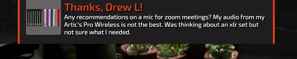 Thanks, Drew L! Any recommendations on a mic for zoom meetings? My audio from my Artic's Pro Wireless is not the best. Was thinking about an xlr set but not sure what I needed.