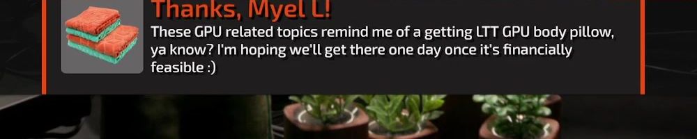 Thanks, Myel L! These GPU related topics remind me of a getting LTT GPU body pillow, ya know? I'm hoping we'll get there one day once it's financially feasible :)