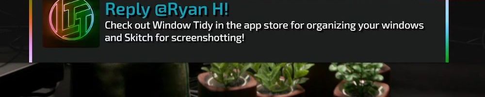 Reply @Ryan H! Check out Window Tidy in the app store for organizing your windows and Skitch for screenshotting!