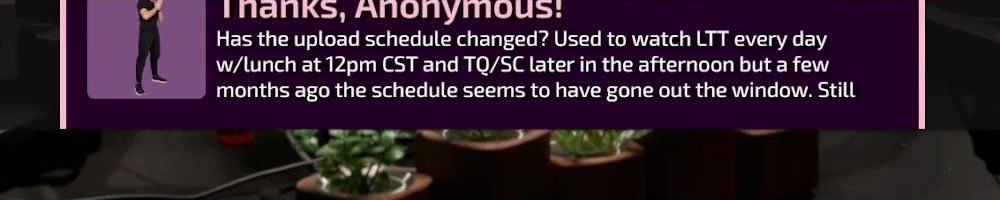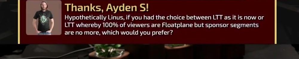 Thanks, Ayden S! Hypothetically Linus, if you had the choice between LTT as it is now or LTT whereby 100% of viewers are Floatplane but sponsor segments are no more, which would you prefer?