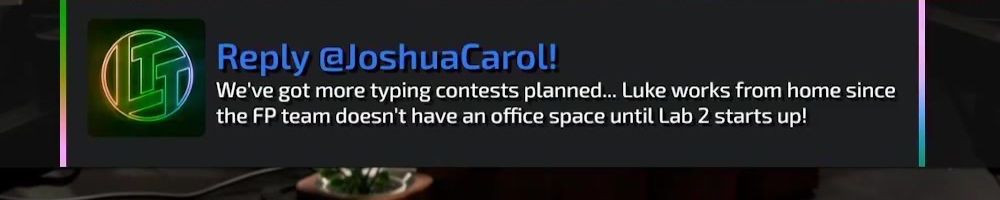 Reply @JoshuaCarol! We've got more typing contests planned... Luke works from home since the FP team doesn't have an office space until Lab 2 starts up!