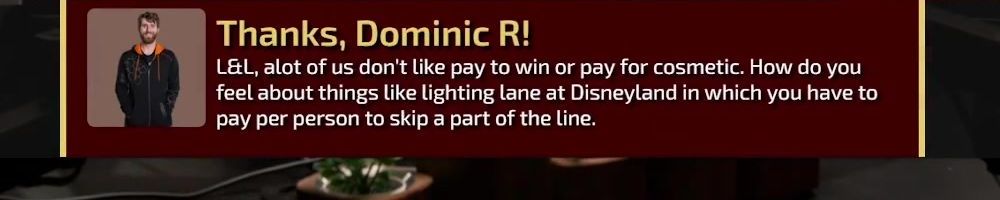 Thanks, Dominic R! L&L, alot of us don't like pay to win or pay for cosmetic. How do you feel about things like lighting lane at