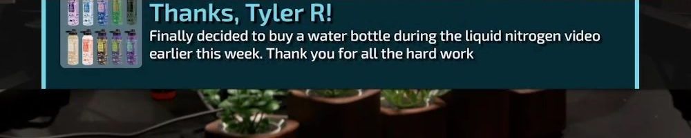 Thanks, Tyler R! Finally decided to buy a water bottle during the liquid nitrogen video earlier this week. Thank you for all the hard work