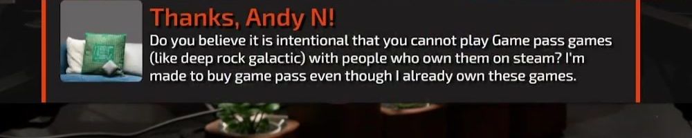 Thanks, Andy N! Do you believe it is intentional that you cannot play Game pass games (like deep rock galactic) with people who own them on steam? I'm made to buy game pass even though I already own these games.