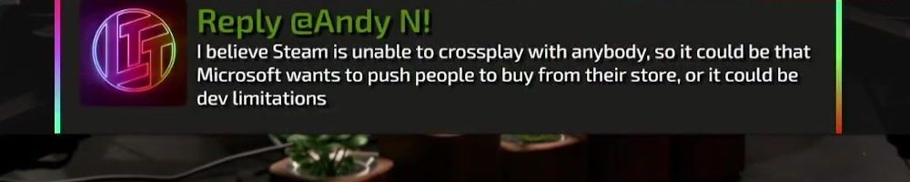 Reply @Andy N! I believe Steam is unable to crossplay with anybody, so it could be that Microsoft wants to push people to buy from their store, or it could be dev limitations