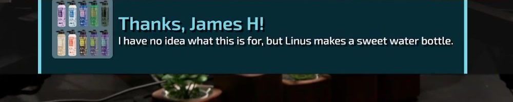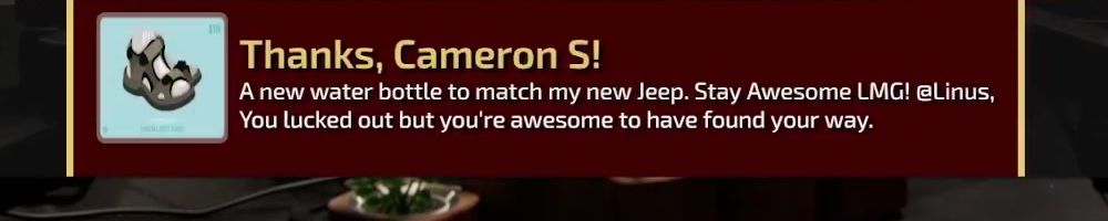 Thanks, Cameron S! A new water bottle to match my new Jeep. Stay Awesome LMG! @Linus, You lucked out but you're awesome to have found your way.