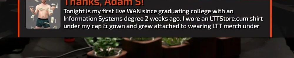 Thanks, Adam S! Tonight is my first live WAN since graduating college with an Information Systems degree 2 weeks ago. I wore an LTTStore.com shirt under my cap & gown and grew attached to wearing LTT merch under
